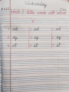 Today 2 letter words with vowel sound ‘e’ in notebook has been introduced in the class.
