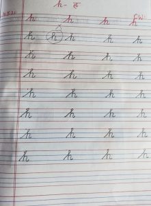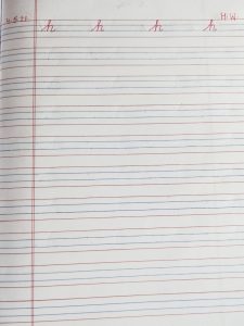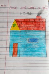 Today practice of alphabet ‘h’  and draw and colour a house in notebook has been done in the class.
