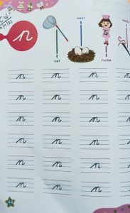Today alphabet ‘n’ has been introduced and practice of alphabet ‘n’ in workbook pg no. 44 and book reading has been done in the class.