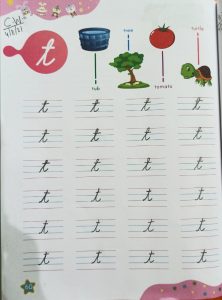 Today alphabet ‘t’ in workbook pg no. 60 has been introduced and book reading has been done in the class.
