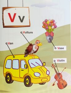Today alphabet ‘v’ has been introduced in the workbook pg no. 68. Book reading has been done in the class.