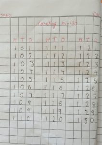 Counting 101-130 October 29, 2021 Jinny kapoorToday counting 101-130 in notebook has been done in the class.Homework for the dayMaths- Learn counting 101-150.