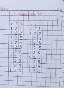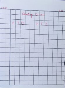Counting 121-130 October 11, 2021 Jinny kapoorToday counting 121-130 has been introduced in the class.Homework for the dayMaths- Do counting in notebook.