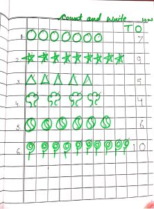 Maths – Do counting 1to 10, shapes and count and write in the notebook