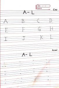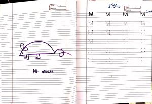 English write alphabet M in the notebook.