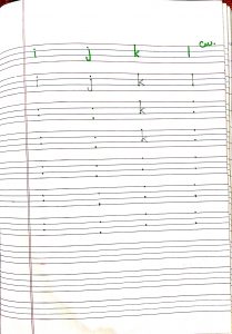 In todays English class recognition and phonics sound of alphabet Aa to Zz and writing pattern of i, j, k, l has been done.