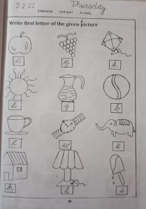 Today exercise ( Write first letter of the given picture) in activity book pg no. 15 has been done in the class.