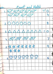In maths Counting and Recognition of numbers 1 to 10 and count and match worksheet has been done. In music independence day rhyme and eng and Hindi story telling has been done.