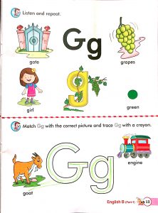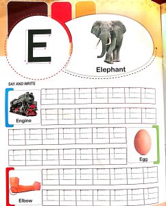 In todays English class recognition and phonic sound of alphabet A to G and writing pattern of alphabet E has been done.