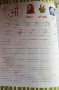 Today practice of swar ‘ ओ’ in workbook pg no. 28 has been done in the class.