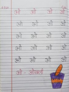 Today swar ‘ओ’ has been introduced and practice of swar in notebook and exercises in workbook pg no. 26,27 has been done in the class.