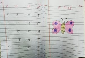 Today practice of vyanjan त and draw and colour a तितली in notebook and book reading has been done in the class.