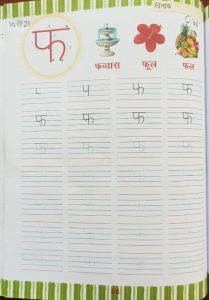 Today introduction of vyanjan फ in workbook pg no. 88 and book reading has been done in the class.