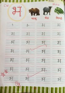 Today introduction of vyanjan भ in workbook pg no. 92 and book reading has been done in the class.